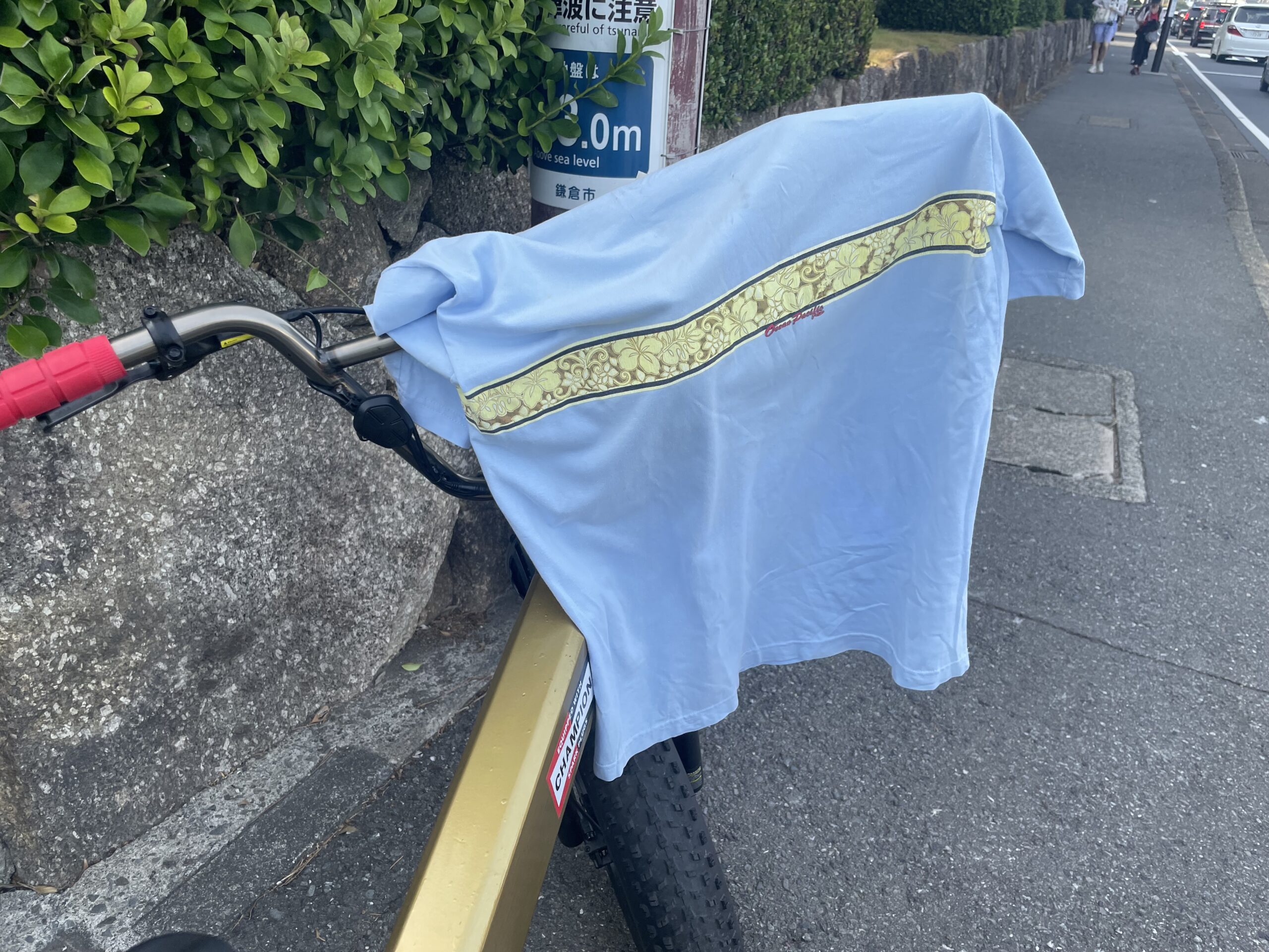 今年の夏に、MATE Xで鎌倉の稲村ヶ崎に行ったときに付近の古着屋さんでTシャツを買った時の写真です。