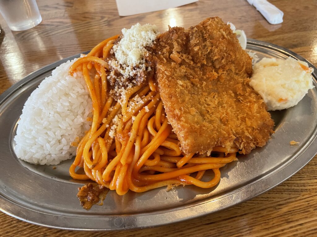 ナポリタン以外にチキンカツも乗って、ポテトサラダも付いてきてワンプレートで運ばれてきました!このビジュアル、最高に食欲をそそられる逸品です!
