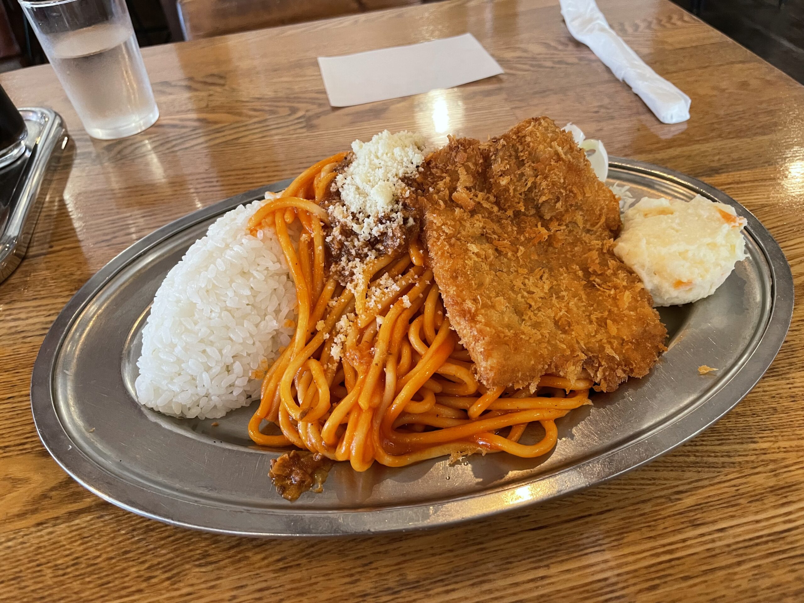 ナポリタン以外にチキンカツも乗って、ポテトサラダも付いてきてワンプレートで運ばれてきました!このビジュアル、最高に食欲をそそられる逸品です!