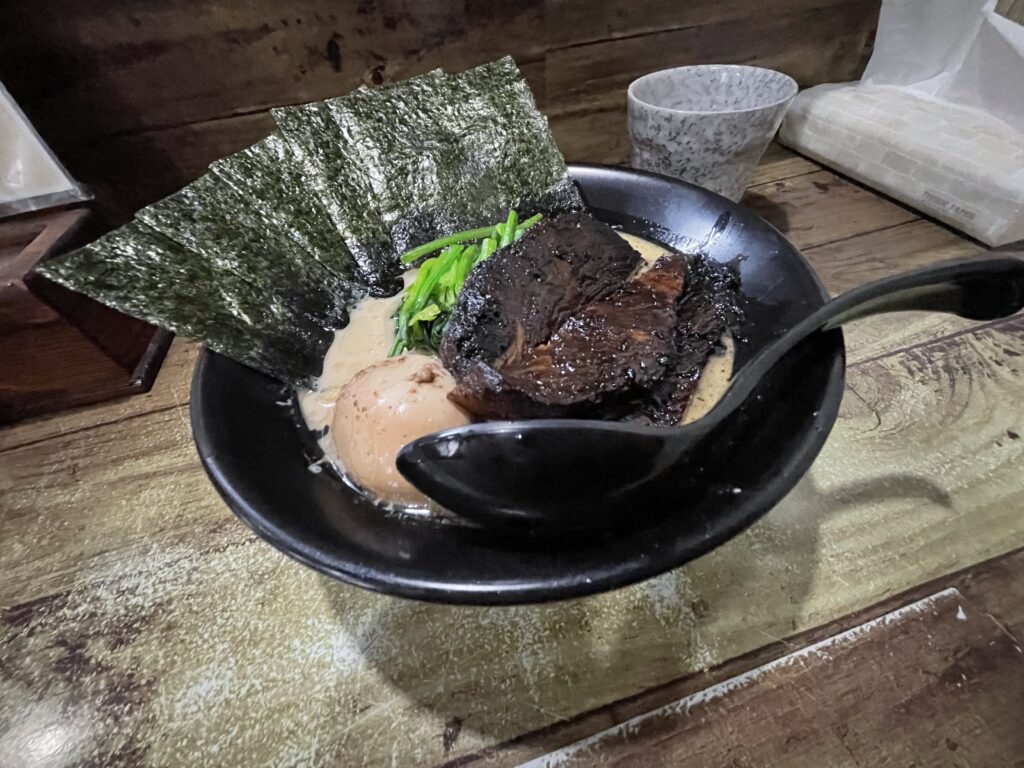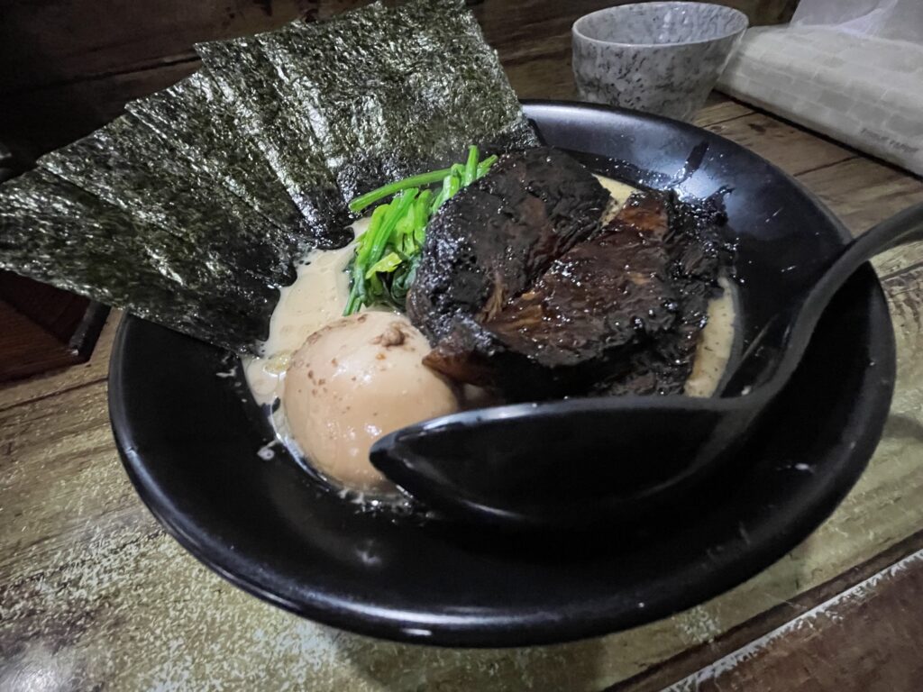 麺家蔦重さんは、豚骨をベースにしたスープで、味はまろやかで癖がなく美味しいラーメンで、写真では黒く大きな塊があるのがわかると思いますが、じつはこれがチャーシューで食べ応えがあって、満足のいくラーメンでした!