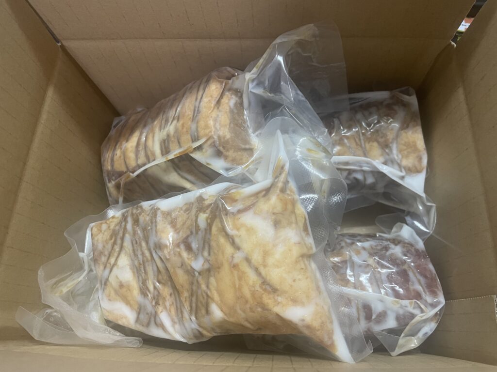 カチンコチンに凍った状態で送られてくるので、食べるときはお湯で解凍します。