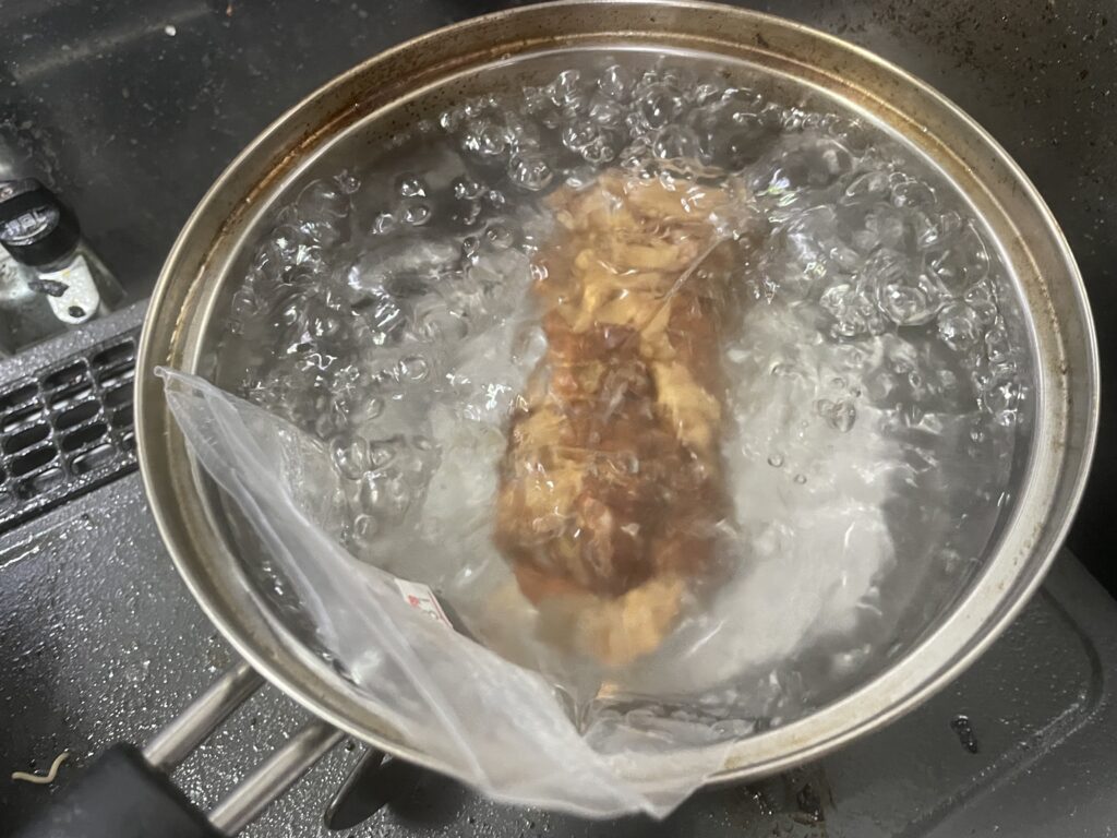 15分ほど熱湯で、温めると柔らかいチャーシューが食べられるようになります。
